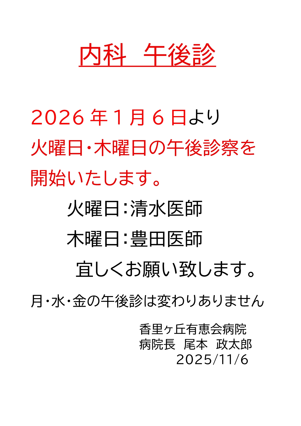 内科 午前診察の一部変更のお知らせ
